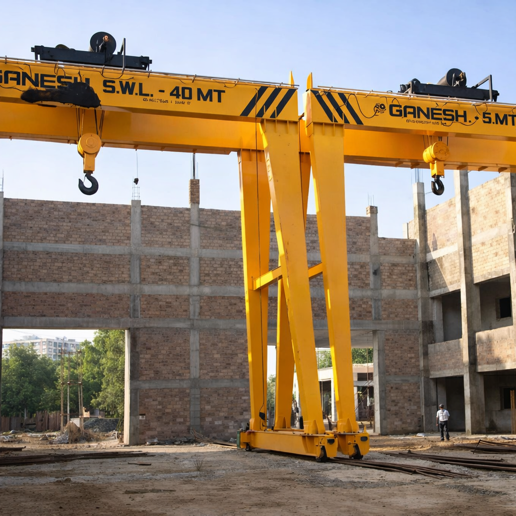 These cranes are available in single girder type or double girder type as well as EOT Cranes but these cranes are run on floor mounted rail by its two legs which is fabricated from steel section or plates, Our Robust gantry crane which save your expensive structure cost, easily expandable long travel whenever you need you may expand longitudinal travel with low cost compare to EOT,no need of heavy structure and foundations, easily disassembly and transfer ay anywhere, useful for temporary light or heavy work. 3t. to 100t. Cap., up to 55-meter span Double Girder type and required Height of lift (Higher Capacity and span also available on request).